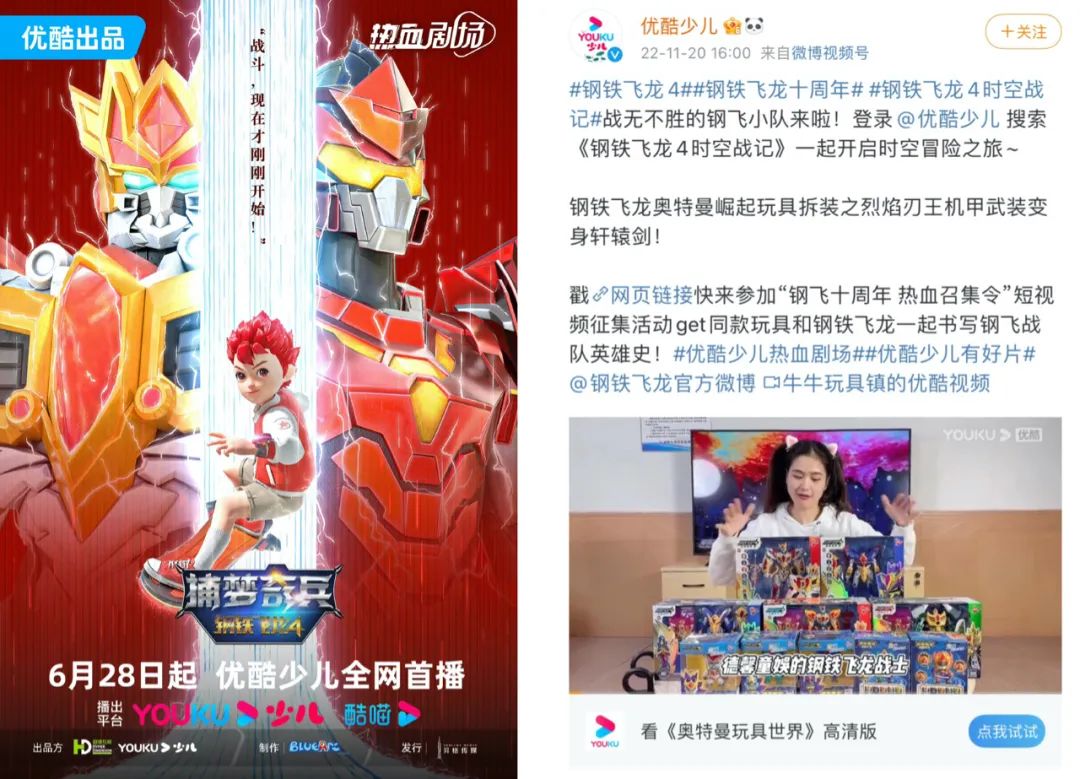 《钢铁飞龙4捕梦奇兵》由超维互娱、优酷少儿、蓝弧文化出品,为冒险、战斗元素少儿动画。据了解,产业上,2022年优酷少儿产业化品牌小小优酷升级,形成货品+宣发+销售的三元矩阵,进一步解决内容IP的多元化衍生难题,定制IP专属玩法,开发SKU超300+。除了《小狼乐宾》20多款周边同步热销,作为最受欢迎的中国机甲英雄IP之一,《钢铁飞龙》系列已授权开发玩具、服装、食品等20个品类的产品,SKU超过192个。实现了从内容平台到产业多元化的战略升级。