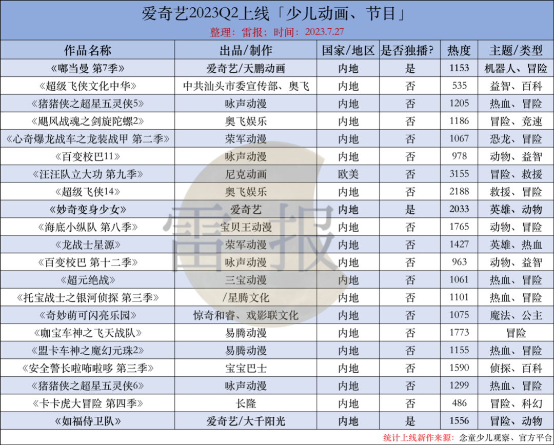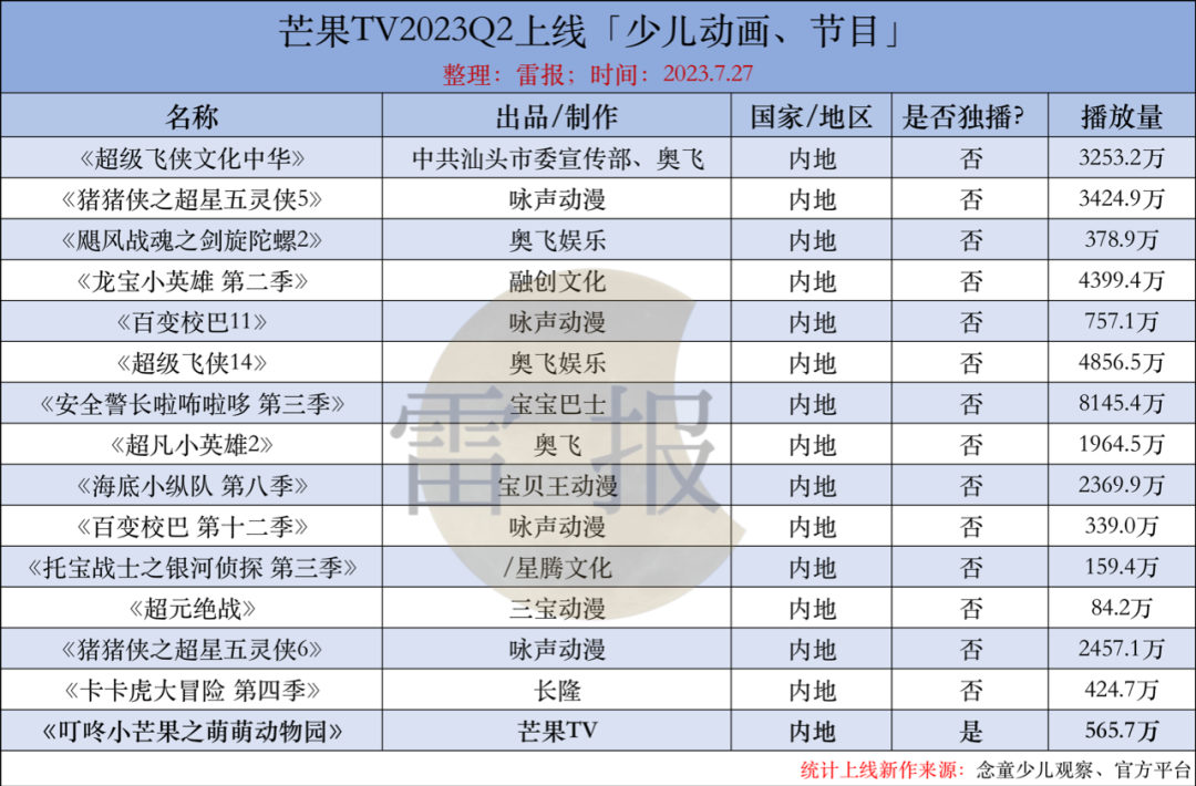 总的来说,上半年,经典、旧作频出,新作也稳步推出,还有不少的海外动画,一些头部IP作品吸引力依旧显著,头部公司强势产出、开拓。视频平台在更深度入局少儿IP和消费市场,Q3伴随悠长暑期的到来,少儿内容市场应该会更加精彩。