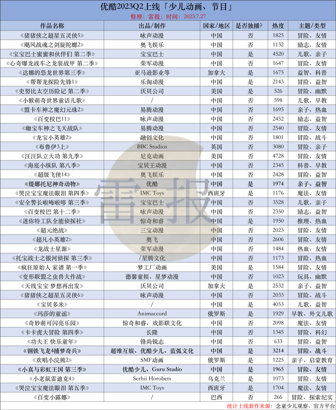 据统计,优酷上半年上线72部少儿动画、节目,参与出品8部,独播31部。