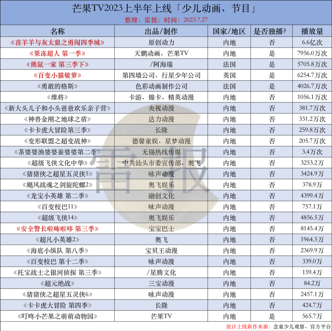 芒果TV:26部新作,2部出品作品,《喜羊羊与灰太狼》系列动画播放量超6亿