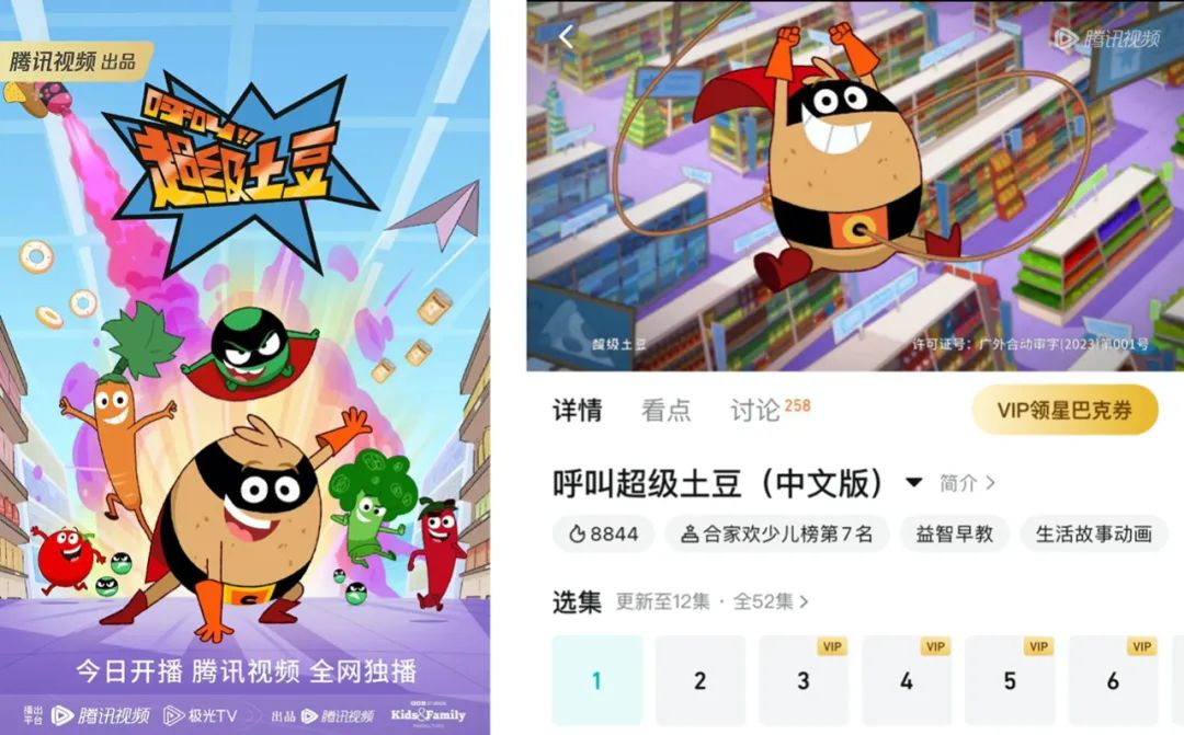 《呼叫超级土豆》则是腾讯视频联手BBC金牌儿童团队打造,据了解改编自苏·亨德拉(Sue Hendra)和保罗·林内特(Paul Linnet)所著的同名畅销绘本,讲述了超级土豆和他的蔬菜伙伴们全力以赴阻止豆豆大王占领超市的喜剧冒险故事。6月1日上线腾讯视频时,该作也在英国同步播出。在腾讯视频有中文版和英文版供用户选择,中文版当前热度为8844,位于合家欢少儿榜第7名。