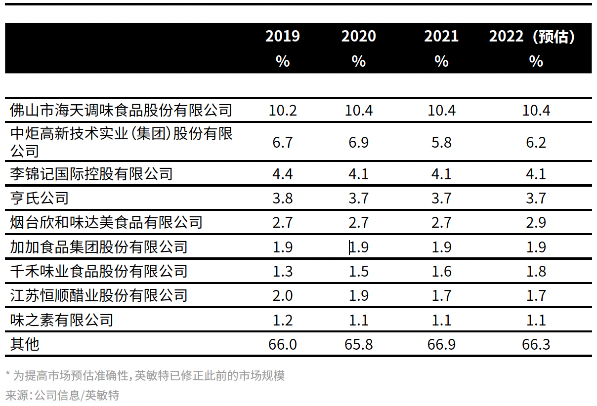 根据界面新闻获得的市场调研机构英敏特数据显示,2019至2022年,在中国酱料和调味品市场,市场份额排名前四的公司始终是海天、中炬高新、李锦记以及卡夫亨氏;它们在2022年预估市场份额分别为10.4%、6.2%、4.1%和3.7%。相比2019年,卡夫亨氏2022年的市场份额下还降了0.1个百分点。