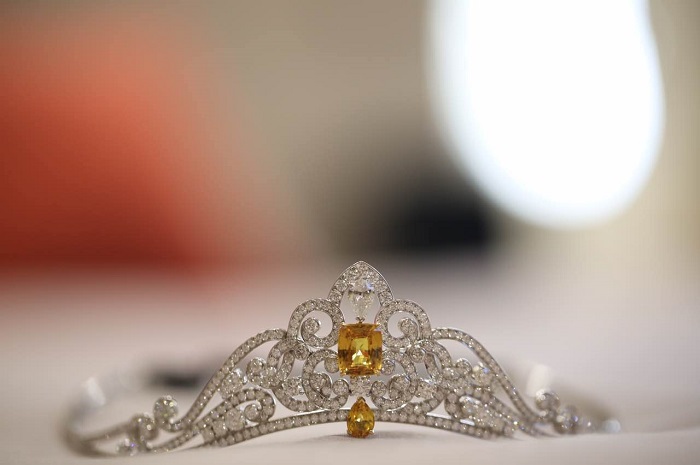 卧室里陈列着由成立于1735年的英国皇室珠宝品牌Garrard专程从纽约大都会博物馆带来这顶精美绝伦的Primrose Tiara 王冠,全世界只有 4 顶,其中一顶在英国凯特王妃手中,另一顶便在这里;床头柜上的 Garrard 的祖母绿宝石的项链,源石采自哥伦比亚,纯度极高,精细打磨后成为绝美的艺术精品。