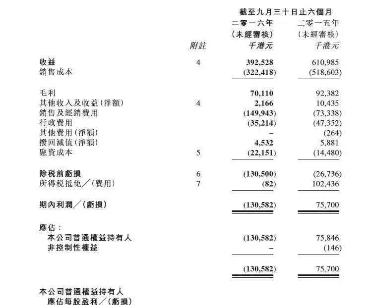 半年业绩显示:于2016年9月30日止,收益3.93亿港元,毛利7000万港元,亏损1.3亿港元。(1港元=0.8905人民币元)