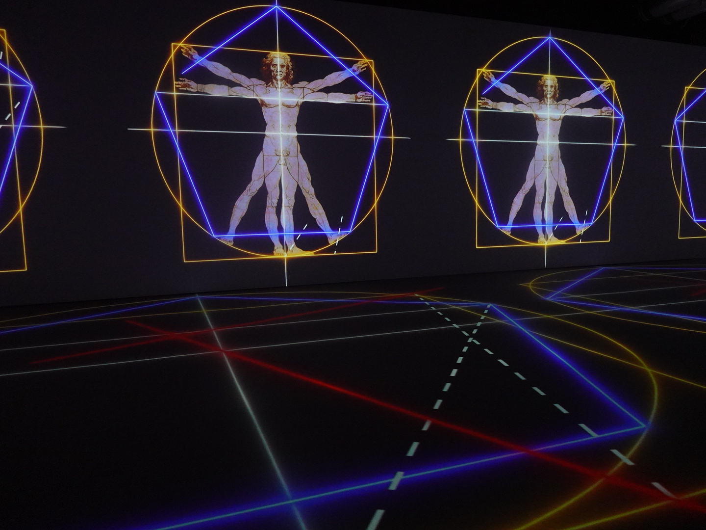 达芬奇用来研究人体比例的手稿《维特鲁威人》,被广泛认为是人物素描的典范之一,本次特展以当代视觉重现这幅欧洲艺术史上的经典之作。达芬奇将人像置于两个几何图形的中心,其正方形代表地球,圆形则代表宇宙,意味着人在两者之间取得完美的平衡,以“神圣比例”展现艺术与科学达致完美和谐之关键。