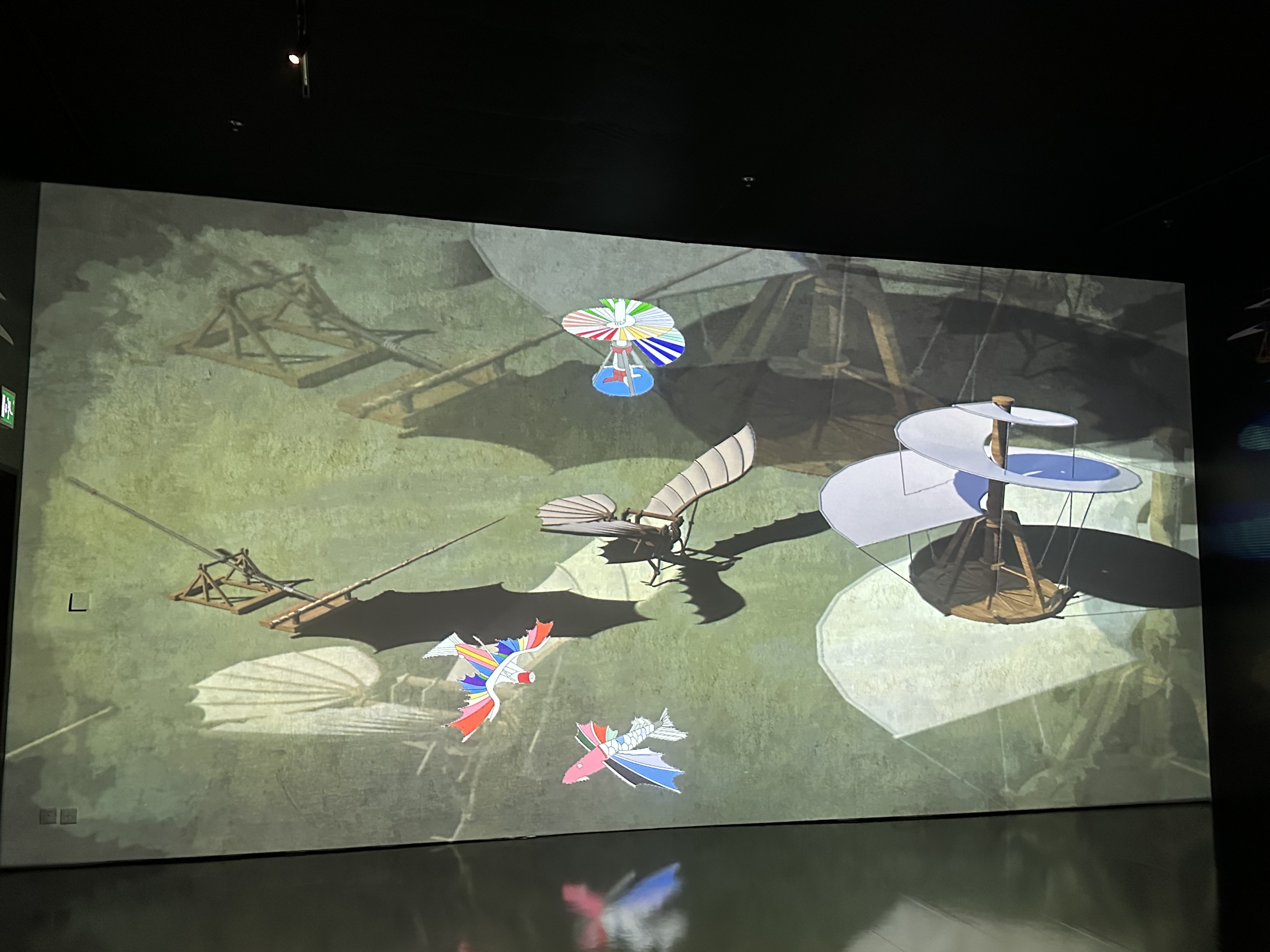 “飞行空间”展墙上的多重投影,正是达芬奇的观察所得和创作发明,还有他在故乡家中所画的第一幅风景画,通过3D重建技术于眼前活灵活现。在这个空间,游客可以绘画出心目中的飞行器,通过投影它能够翱翔天际,让灵感随着达芬奇的创作起飞。