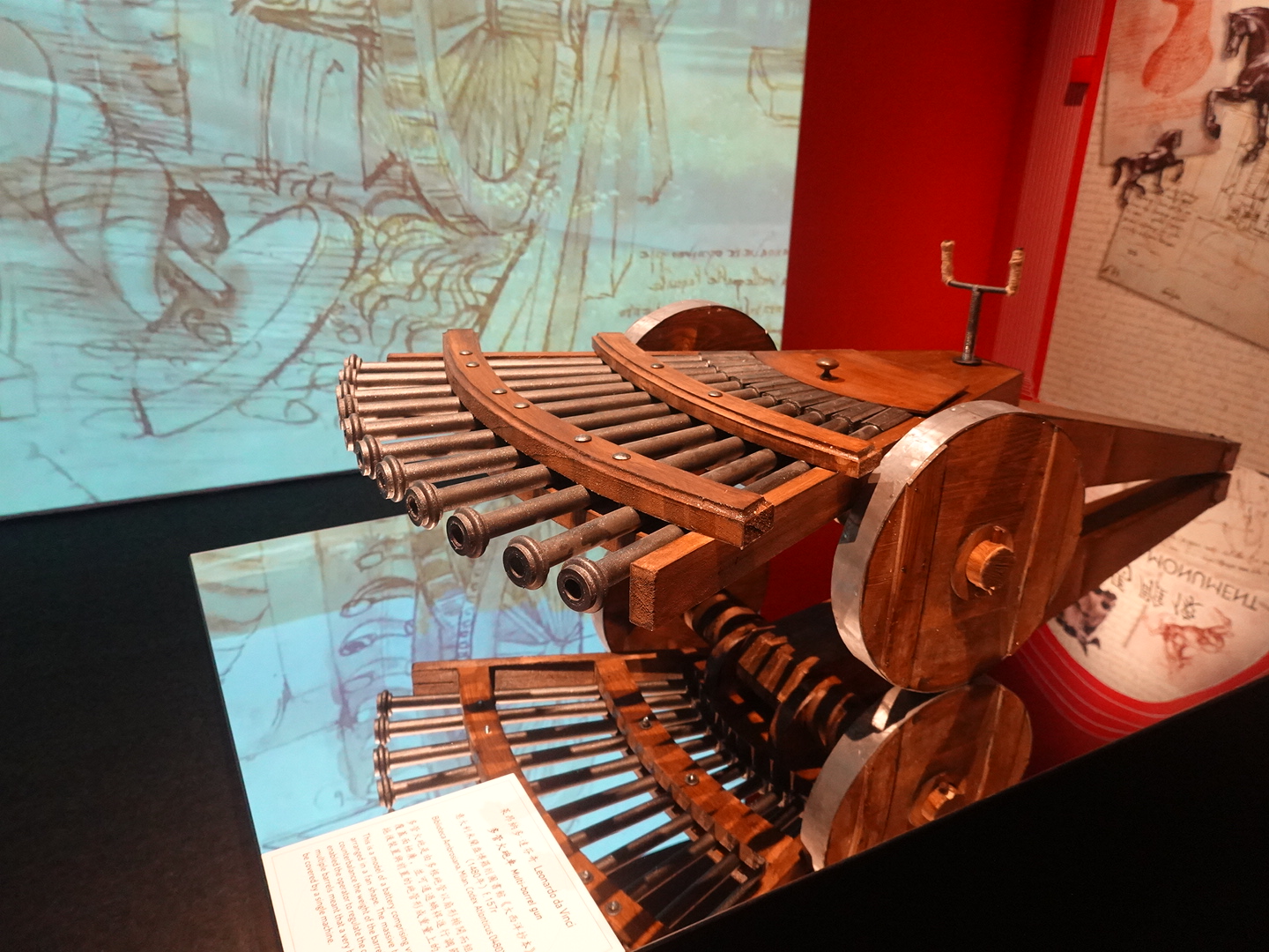 “工程师达芬奇”展区汇聚了达芬奇设计的战争器械的木制模型。达芬奇在米兰公爵卢多维科的宫廷工作期间,设计出了许多战争器械和防御系统,包括投石器、弩机、盖桥云梯和多管火炮车等。本次展出的模型皆为意大利纯手工制作,所选木、铁、棉、绳等材料均源自达芬奇的原创概念。