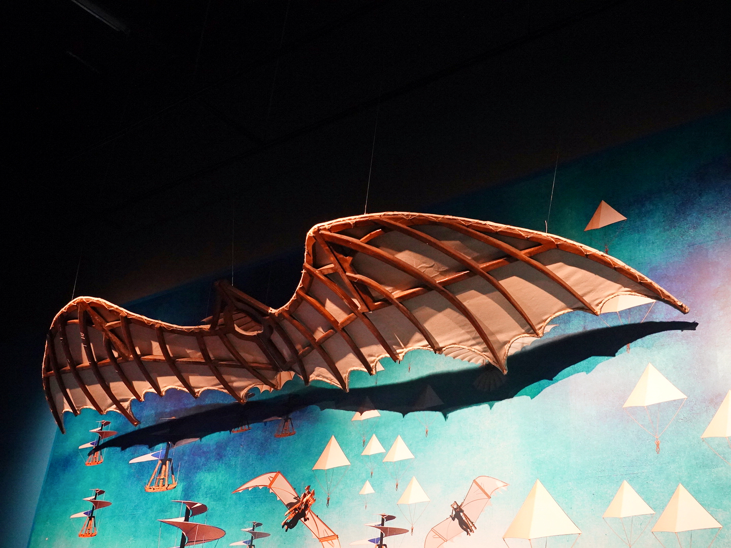 达芬奇被认为是有史以来最伟大的画家之一,在才华横溢的艺术家身份之外,他还是一位现代航空先驱者。达芬奇年轻时着迷于观察鸟类的飞行,研究其飞行动作,梦想人类也能翱翔天际,他的笔记和草图显示出对空气动力学和飞行概念的深刻理解,其中许多被证明是现代航空业发展的基础。展区内的“滑翔机”翼展四米,由佛罗伦斯工匠制作,而概念原图正是出自达芬奇之手。