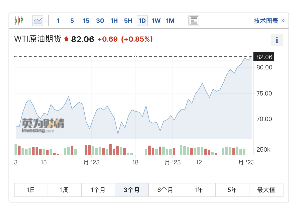 英为财情数据显示,8月2日13点30分左右,WTI原油9月期货价格为82.06美元/桶,涨幅为0.85%;布伦特原油10月期货价格为85.61美元/桶,涨幅为0.82%,创今年4月17日以来新高。