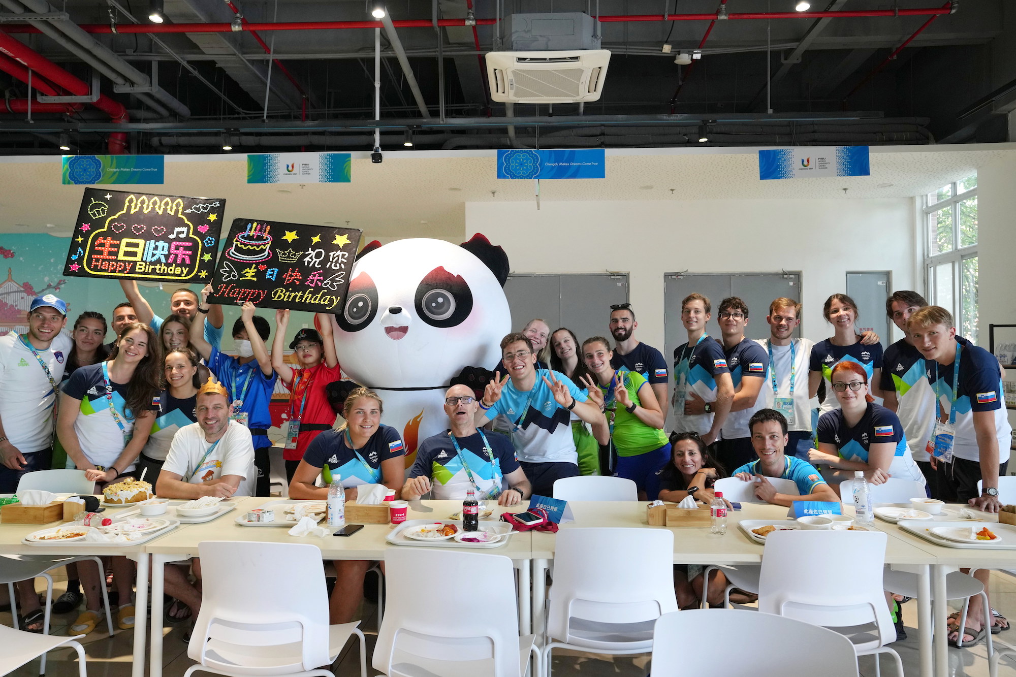 成都大运会开幕以来,蓉宝还会和工作人员一起出现在了大运村运动员餐厅内,为各个代表团的运动员们庆祝生日。