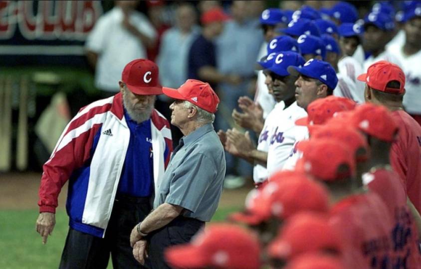 2002年 卡斯特罗与美国总统吉米·卡特在古巴全明星棒球赛