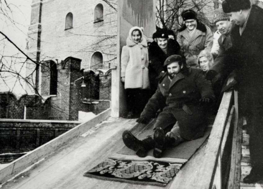 1964 卡斯特罗访问苏联,图为卡斯特罗尝试滑雪橇