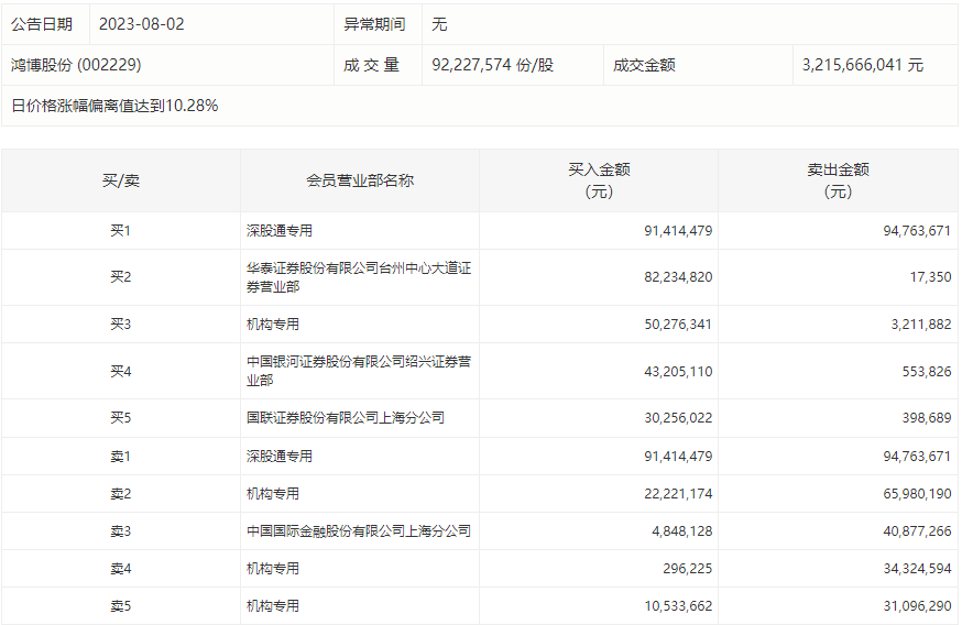 8月2日,鸿博股份今日涨停,龙虎榜数据显示,上榜营业部席位全天成交6.07亿元,占当日总成交金额比例为18.86%。其中,买入金额为3.35亿元,卖出金额为2.71亿元,合计净买入6406.22万元。