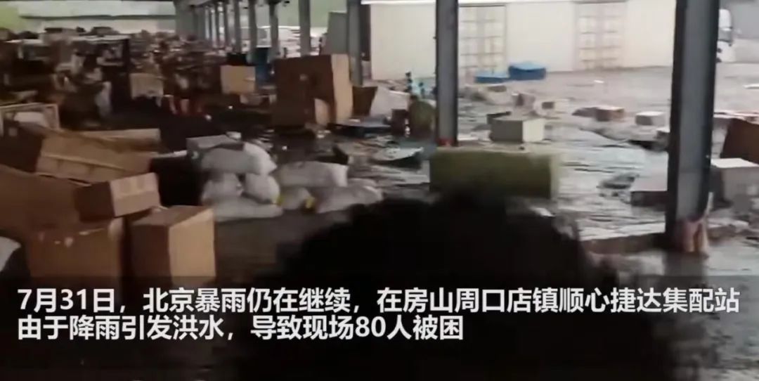 亿豹网了解到,此次受灾严重的房山、涿州等地,有着多家快递、快运企业的分拨转运中心,目前基本处于水淹状态。一段视频显示,位于房山周口店镇的顺心捷达集配站,由于降雨引发洪水,导致现场80人被困,大量货物被冲走,好在人员被及时救出。