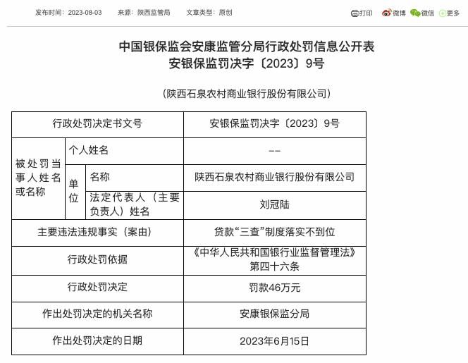 8月3日,国家金融监督管理总局公布的行政处罚信息公开表显示,2023年6月15日,陕西石泉农村商业银行股份有限公司贷款“三查”制度落实不到位,被处罚款46万元。蔡中军对上述违规行为承担直接责任,受到禁止终身从事银行业工作的处罚。