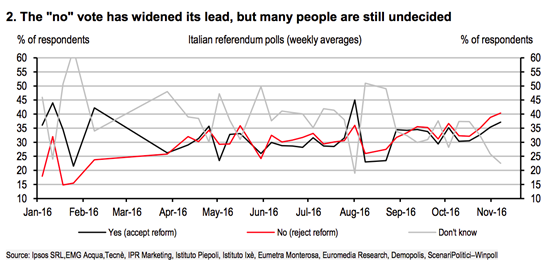 12月4日(本周日),意大利将举行修宪公投。在经历了银行业危机、经济停滞以及移民压力后,公投成败成为意大利长远大局的重要指示灯。如果公投以失败告终,意大利恐怕会成为民粹主义浪潮攻击的下一个对象。