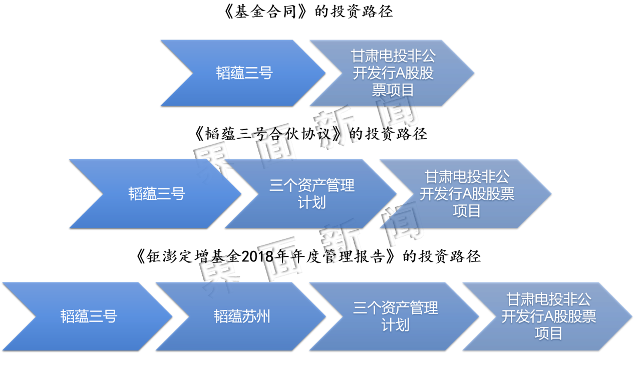 也就是说,从案涉基金的2018年年度管理报告开始(包括其第一次申请仲裁的庭审期间),钜澎资管突然将案涉基金投资甘肃电投定增项目的路径改为:先投资韬蕴三号的优先级有限合伙财产份额,再由韬蕴三号投资韬蕴苏州,再由韬蕴苏州投资平安资产管理计划和华安资产管理计划,最终投向甘肃电投定增项目。