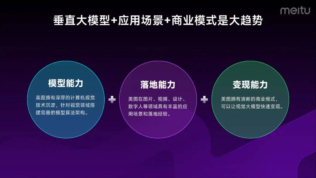 吴欣鸿认为,垂直大模型+应用场景+商业模式是大趋势。美图拥有深厚的计算机视觉技术沉淀,针对视觉领域搭建了完善的模型算法架构。美图在图片、视频、设计、数字人等领域具有丰富的应用场景和落地经验。此外,美图拥有清晰商业模式,可以让视觉大模型快速变现。