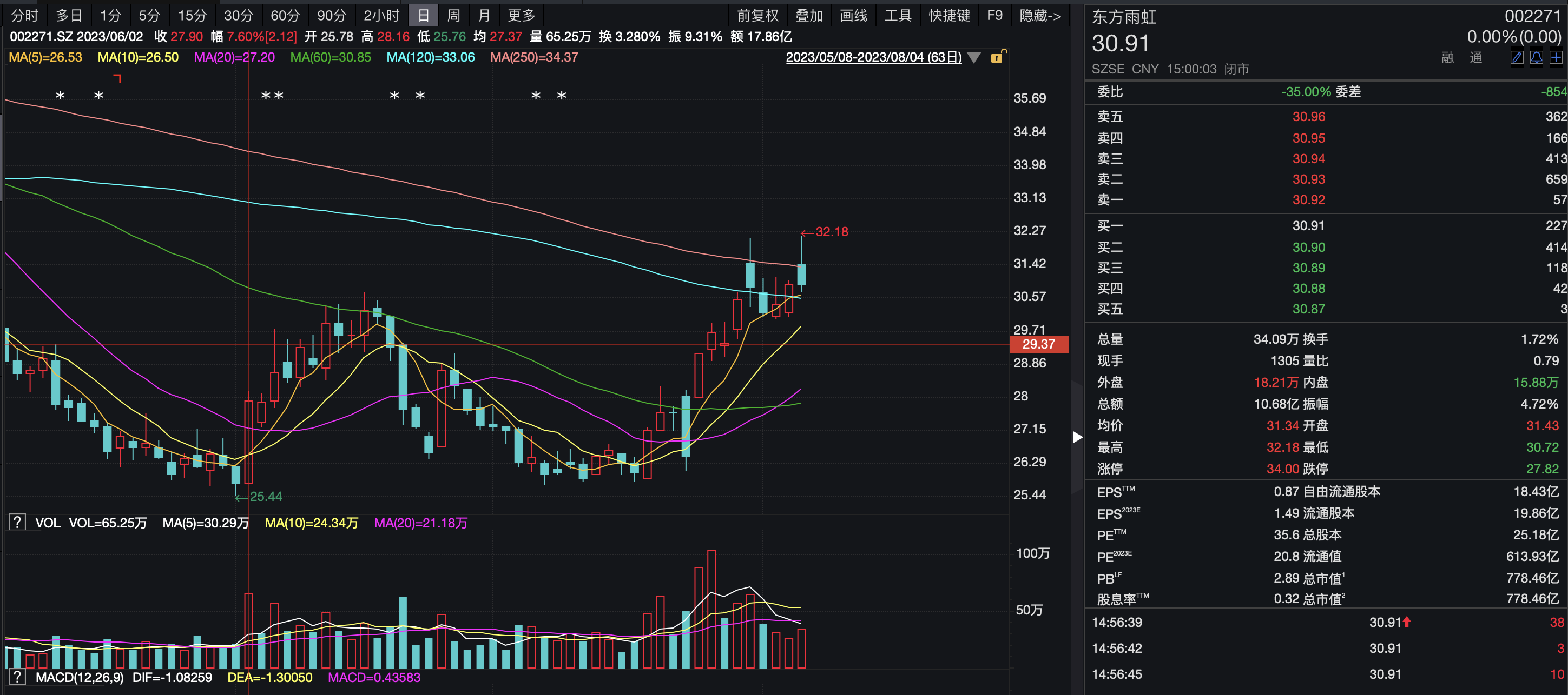 但在6月末7月初,其股价逐渐回落。7月20日,东方雨虹第6次参与北京土拍,至今股价呈上升趋势。