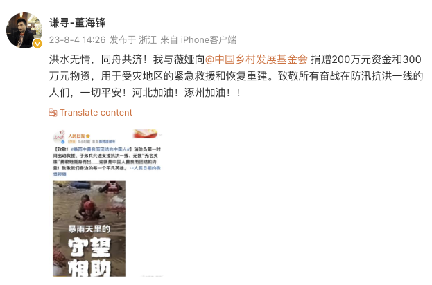 8月4日,谦寻控股董事长董海锋发布微博称,其与薇娅向中国乡村发展基金会捐赠200万元资金和300万元物资,用于受灾地区的紧急救援和恢复重建。