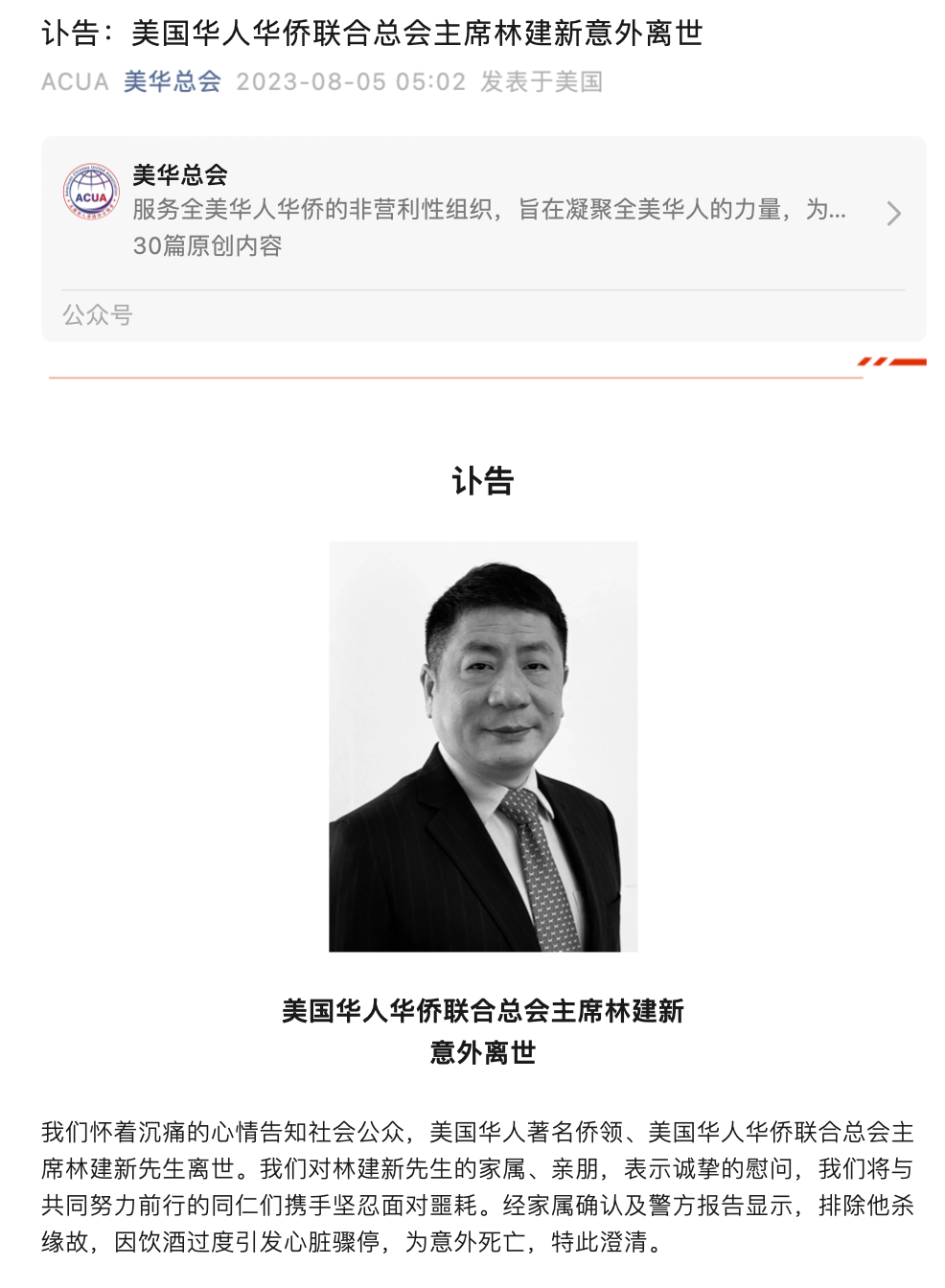 8月5日,美国华人华侨联合总会发布讣告称,美国华人华侨联合总会主席林建新离世。经家属确认及警方报告显示,排除他杀缘故,因饮酒过度引发心脏骤停,为意外死亡,特此澄清。
