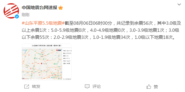 据@中国地震台网速报,截至08月06日06时00分,共记录到余震56次,其中3.0级及以上余震1次:5.0-5.9级地震0次,4.0-4.9级地震0次,3.0-3.9级地震1次;3.0级以下余震55次:2.0-2.9级地震3次,1.0-1.9级地震34次,1.0级以下地震18次。