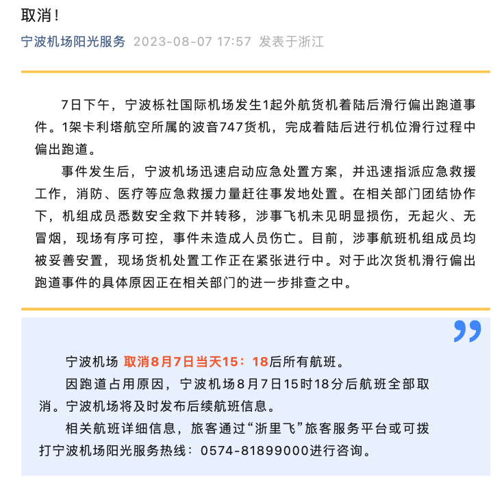 8月7日,据“宁波机场阳光服务”微信公众号消息,因跑道占用原因,宁波机场8月7日15时18分后航班全部取消。宁波机场将及时发布后续航班信息。