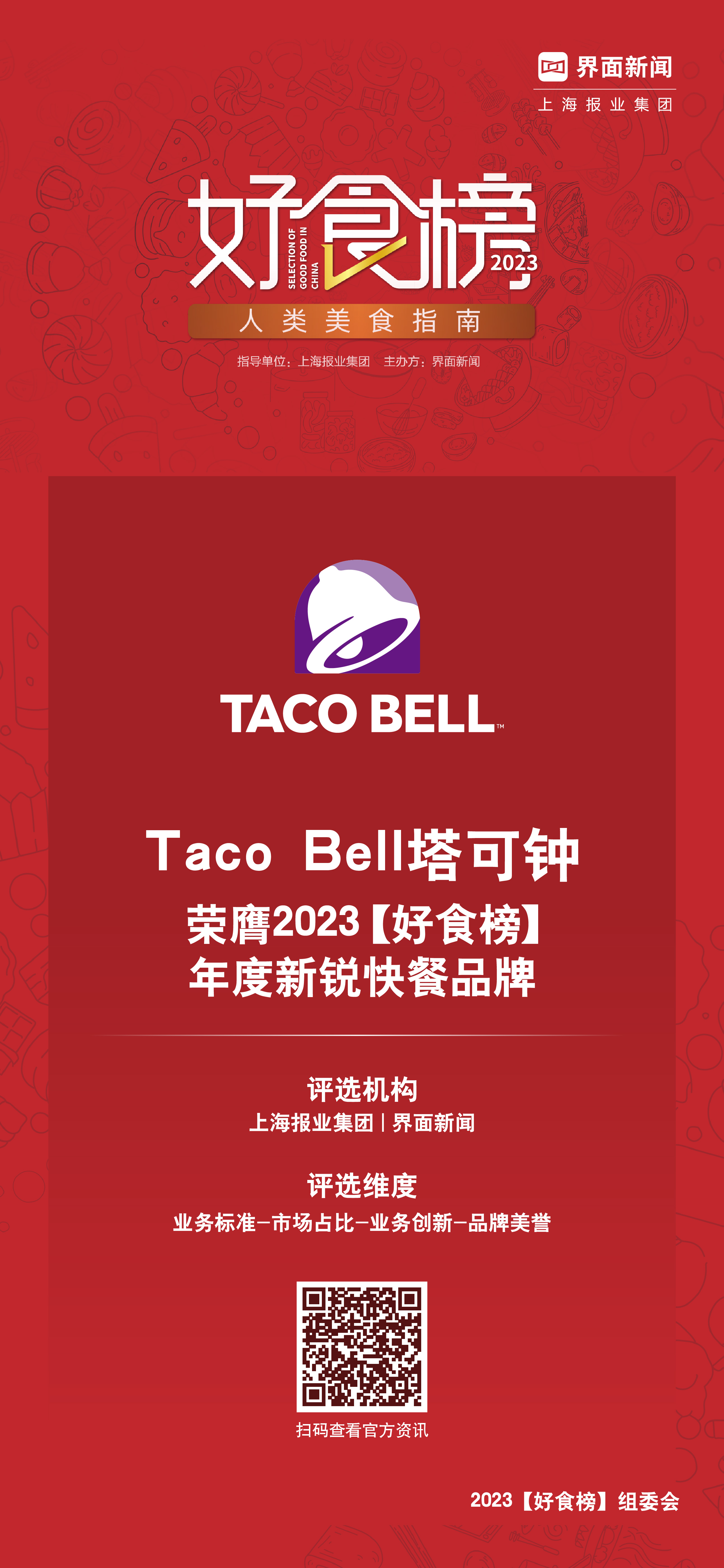 8月10日,上海报业集团丨界面新闻成功举办第六届【新消费盛典】,并在盛典上颁发2023【好食榜】Top50大奖。经过一系列激烈的角逐,2023【好食榜】从最终入围的150多个品牌中甄选出50个荣耀席位。Taco Bell塔可钟凭借其独特的美式墨西哥菜品和持续创新的用餐体验,成功脱颖而出,成为令人瞩目的年度新锐品牌,荣获2023好食榜【年度新锐快餐品牌】大奖。