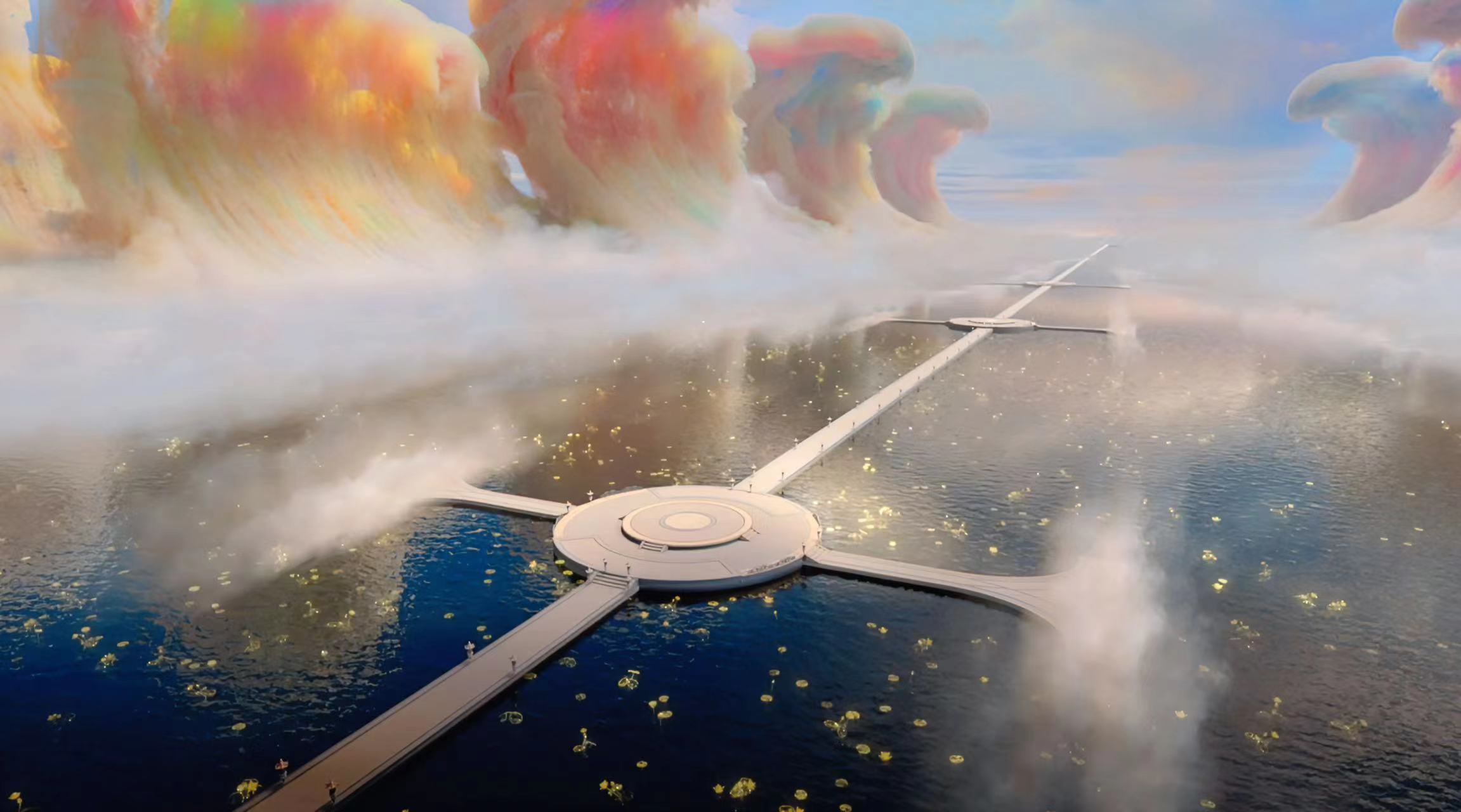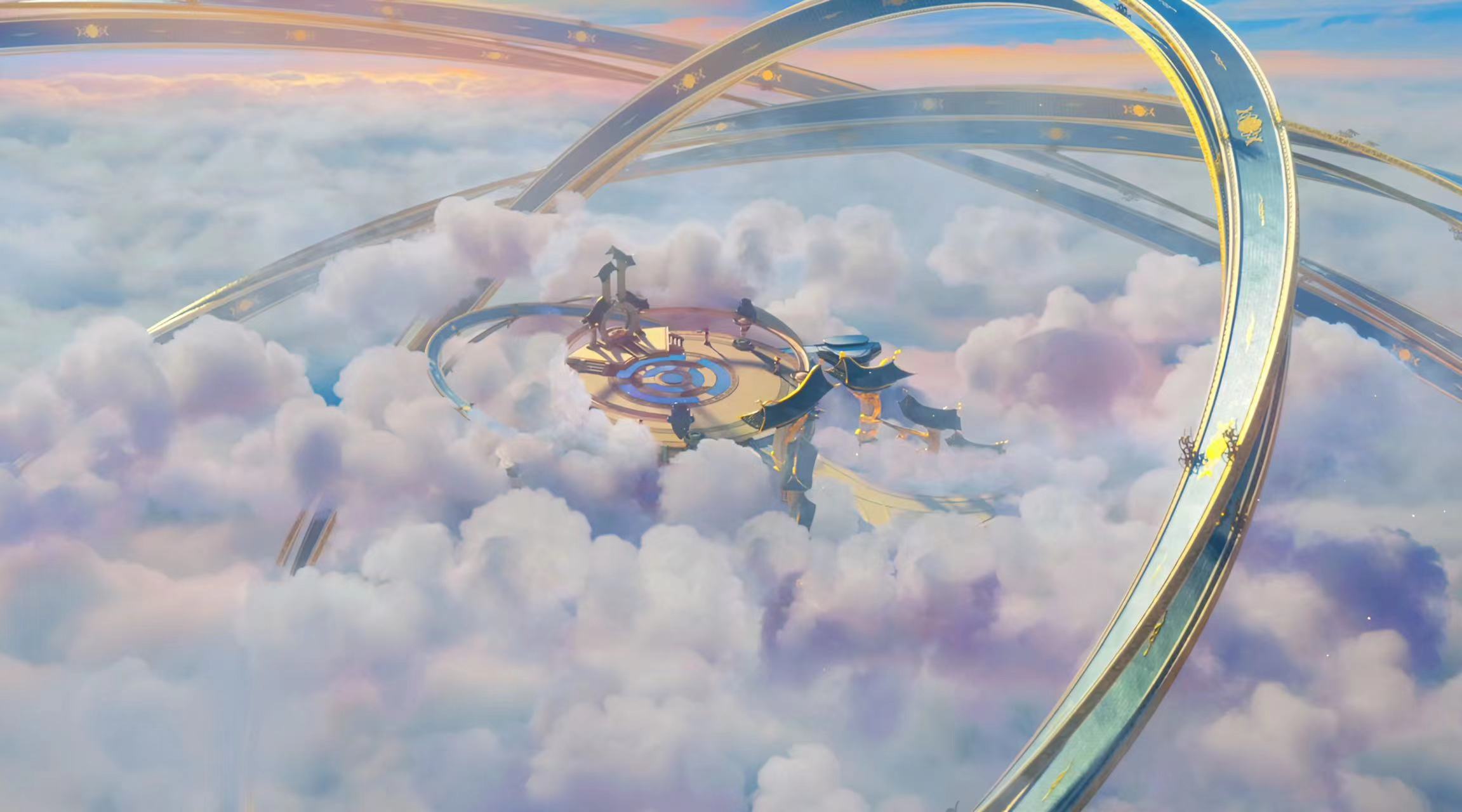 天界以不同的中国传统云纹为灵感,像是如意云纹、团云纹、云气纹,包括敦煌壁画中的飞天祥云及流云图案等,结合精致的后期特效,呈现出与“七彩祥云”概念相呼应的流光溢彩的云朵环境;其中的建筑,大量地采用了环形、圆形结构和设定,这种美学观点与传统文化中“圆满”、“包容”等思想内涵也相契合。