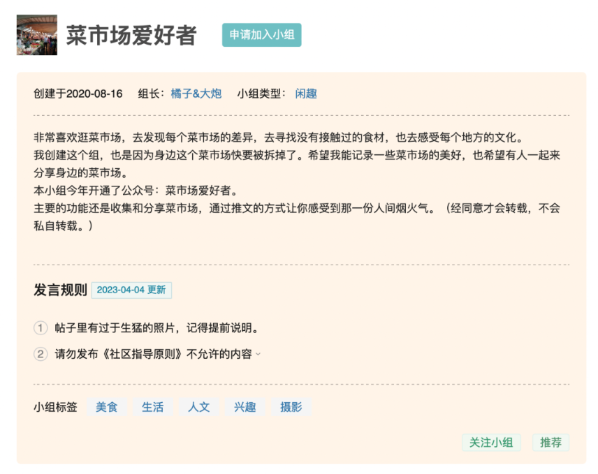 小组于2010年创立,在2020年突破10万组员,而到了2023年,人数已经接近16万人,年轻人的“菜市场热”让小组也逐渐变得热门。
