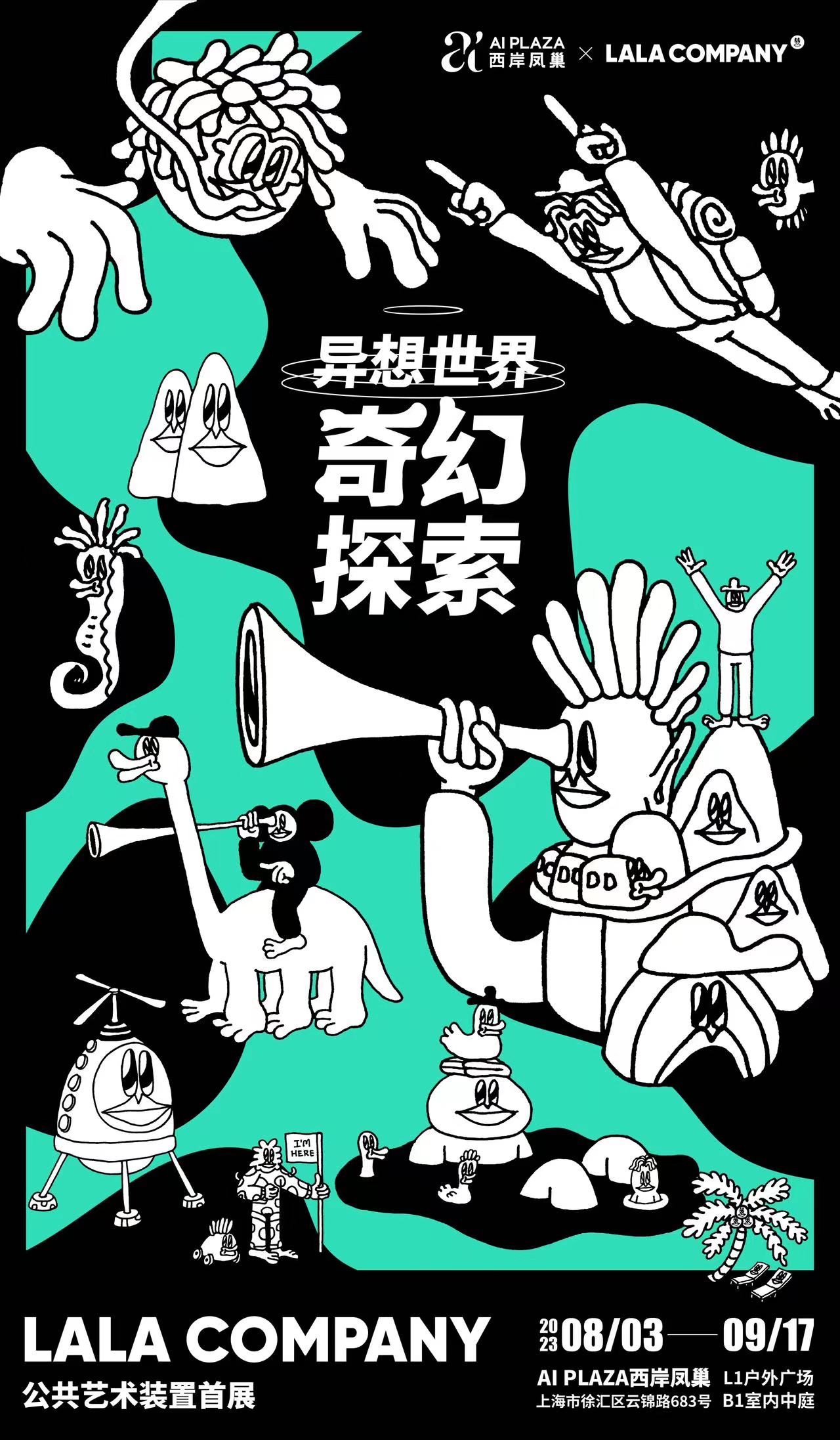 8月3日,AI PLAZA西岸凤巢携手LALA COMPANY 举办的“异想世界 · 奇幻探索”公共艺术装置首展正式开幕。此次展览以LALA COMPANY插画形象为主角,通过3D立体大型装置的呈现,为大众展示线条世界的纯粹和生活的留白。LALA COMPANY 是由来自马来西亚的插画艺术家兼平面设计师 Radio Woon 于2004年开创的插画项目。Radio这次以他笔下的人物为视角,创作了一系列未知世界的奇幻场景和异想体验:从史前探索到外太空遨游,从深海潜水到山洞冒险, LALA COMPANY 的成员化身为旅行者、冒险家、宇航员、甚至是深海里的奇异生物。