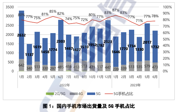 8月11日,中国信通院最新报告显示,2023年6月,国内市场手机出货量2214.9万部,同比下降20.9%,其中,5G手机1732.2万部,同比下降24.8%,占同期手机出货量的78.2%。2023年1-6月,国内市场手机总体出货量累计1.30亿部,同比下降4.8%,其中,5G手机出货量1.02亿部,同比下降6.4%,占同期手机出货量的78.9%。