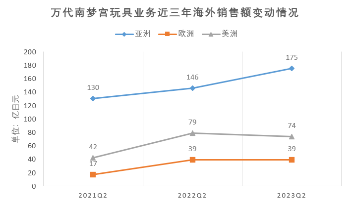 玩具业务主要包括经营玩具卡片、塑料模型、生活用品、文具等的企划、开发、制造和销售。据财报显示,2023年Q2万代南梦宫玩具业务销售额为1203.7亿日元,同比增长26.9%,部门利润为236.3亿日元,比上年同期大增64.5%。其中海外销售额288亿日元,其中美洲74亿日元,欧洲39亿日元,亚洲175亿日元。