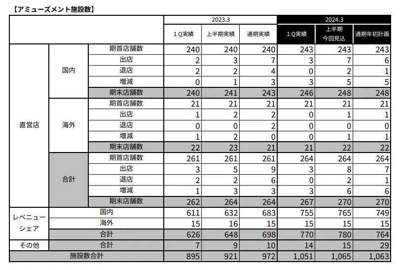 截至2023年6月30日止,万代共计有267家直营店,其中日本本土246家,海外21家。日本本土游艺设施的现有店铺销售额比去年同期增长2.6%。
