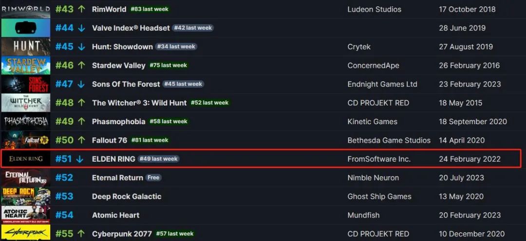 8月1日-8月7日Steam销量周榜中《艾尔登法环》跌出前50