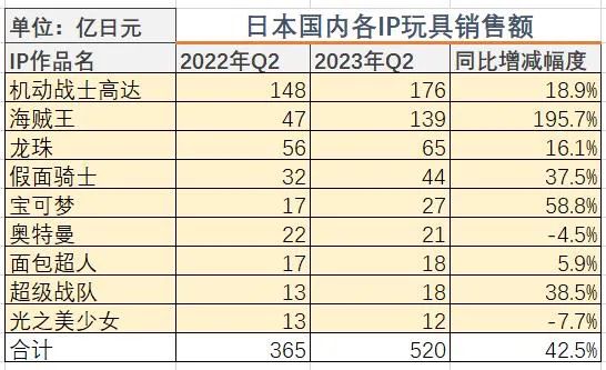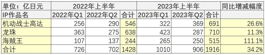经计算,上半年TOP3的IP销售总额1916亿日元,同比增长34.2%。其中,《机动战士高达》691亿日元,《龙珠》710亿日元,《海贼王》515亿日元,分别比上年同期增长26.6%、11.3%、111.1%。