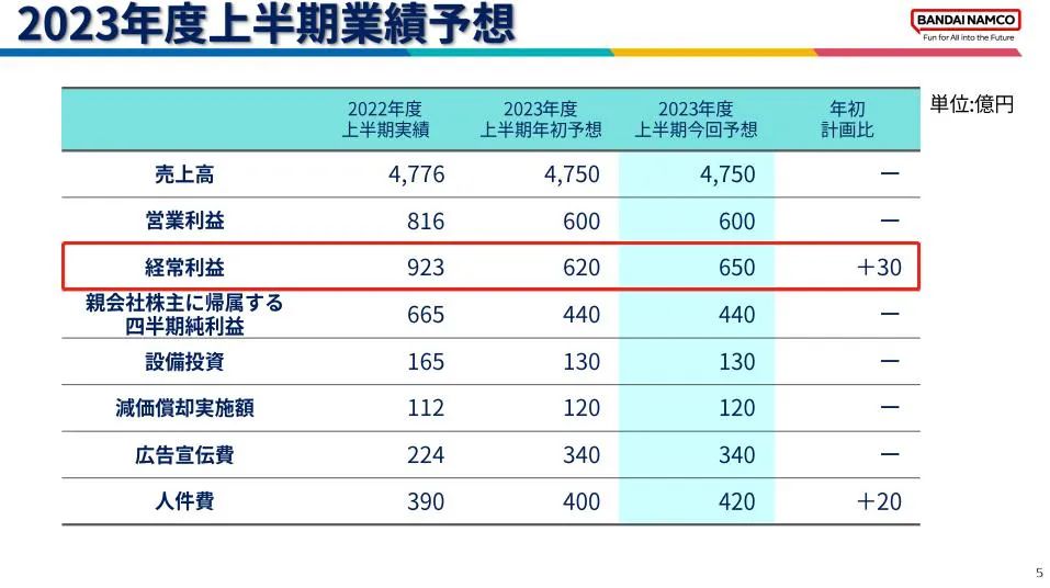 万代南梦宫还将2023年上半期(4月-9月)的经常利润从原来预期的620亿日元上调4.8%至650亿日元。集团CEO川口勝在近期访谈中提及2023年度数字业务的小目标,“将争取实现历史最好业绩”。