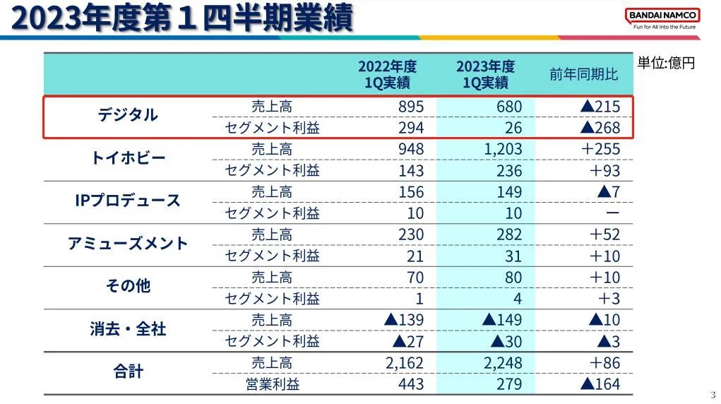 数字业务以游戏内容的企划、开发、销售为主。据财报显示,数字业务2023年Q2共实现销售额680.4亿日元,比上年同期减少24.1%,部门利润为26.6亿日元,比上年同期减少91%。
