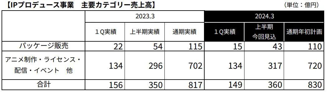在IP制作单元方面,财报显示,2023年Q2这一业务单元共计实现销售额149.9亿日元,同比减少4.4%;部门利润10.6亿日元,与去年同期持平。其中,动画的制作、授权、发布、活动等相关业务实现收入134亿日元,也与去年同期持平。