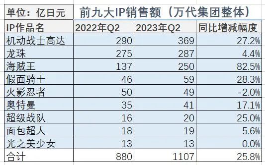 从不同IP来看, 2023年Q2,万代旗下IP全线产品销售额前九名依次分别是:《机动战士高达》369亿日元、《龙珠》287亿日元、《海贼王》250亿日元、《假面骑士》59亿日元、《火影忍者》49亿日元、《奥特曼》41亿日元、《超级战队》20亿日元、《面包超人》19亿日元、《光之美少女》13亿日元。(按部分间交易消除前销售额计算)