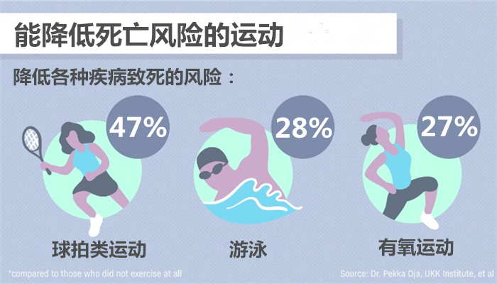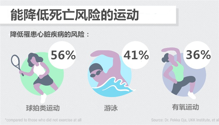 三种运动——游泳、有氧运动和球拍运动——能显著降低心脏疾病和其他疾病致死的风险。