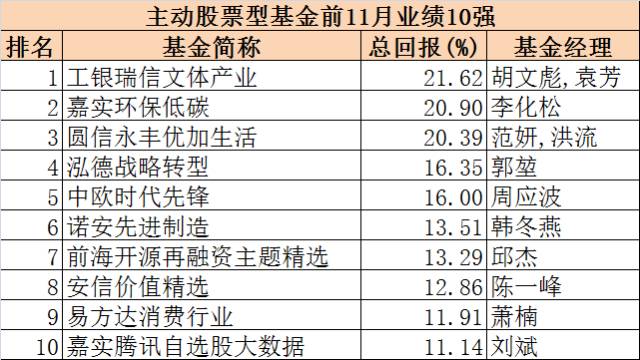 主动股票型基金前11月业绩10强: