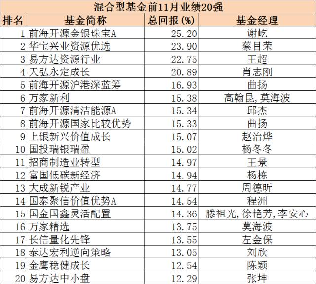 混合型基金前11月业绩20强: