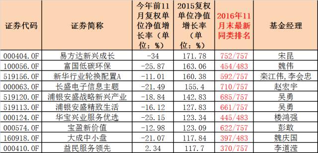 带着为“老明星”送关怀的心情,基金君看到他们过的非常不好,他们同样没能逃脱“冠军魔咒”:去年的“十大牛基”今年绝大多数黯然失色,业绩甚至沦为倒数,去年业绩的大幅领先并没能带来收益“长跑”的先发优势,而最惨的一只基金竟然是去年的业绩冠军——易方达新兴成长,今年前11月亏损34%,还在混合型基金中排名倒数第六位。