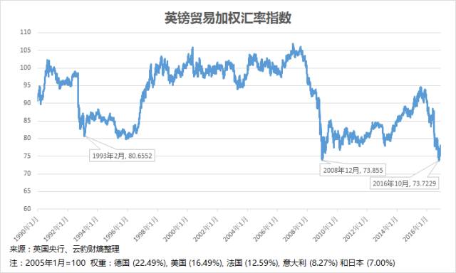 最新一次是席卷全球市场的“退欧风暴”。“退欧”黑天鹅飞出之后,按贸易加权衡量的英镑汇率收跌上月一度至168年新低73.73,跌穿2008年金融危机、1992年英国退出欧洲汇率机制和1931年退出金本位制等任何一次危机时的低点。