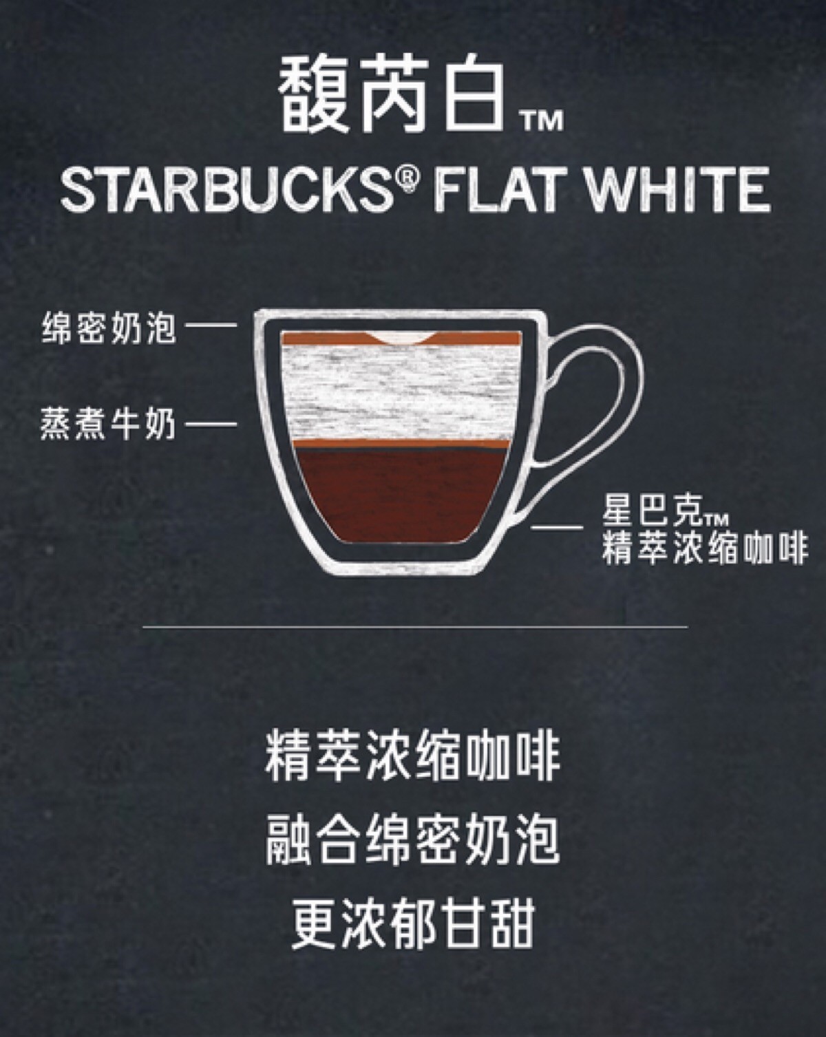 而这大冬天的尖队又惦记起咖啡店里常见的拿铁、卡布,当然最爱的还是Flat White,它还有一个略带诗意的中文名称“馥芮白”,这是星巴克在将这款红遍欧美的年轻咖啡品类推入中国市场时起得名字。