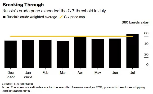 据IEA数据,7月俄罗斯海运原油的加权平均价格跃升至每桶64.41美元,而西方去年设定的价格上限为每桶60美元。