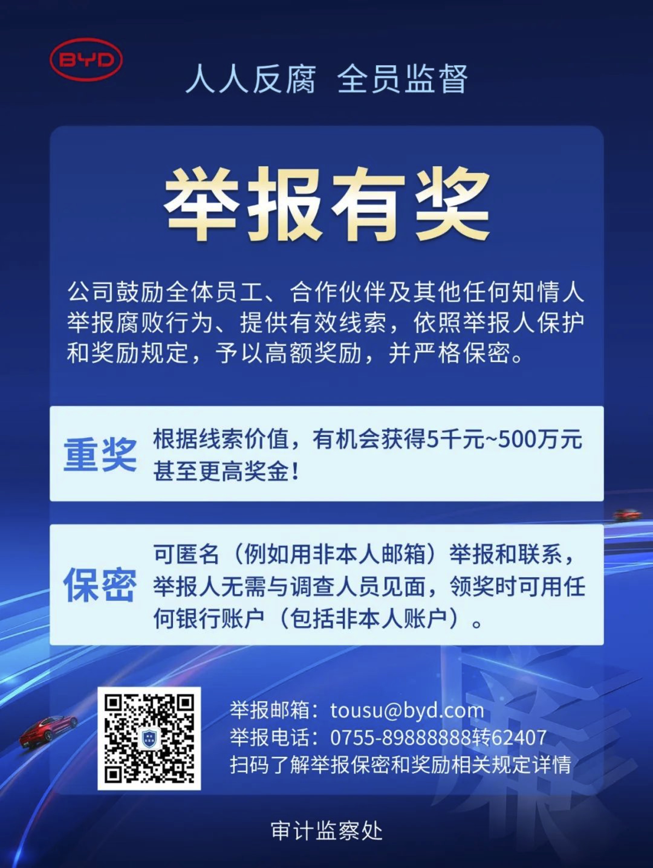 8月16日,比亚迪审计监察处通过“廉洁比亚迪”微信公众号发文称,公司鼓励全体员工、合作伙伴及其他任何知情人举报腐败行为、提供有效线索,依照举报人保护和奖励规定,予以高额奖励,并严格保密。根据线索价值,举报人有机会获得5千元-500万元,甚至更高奖金。