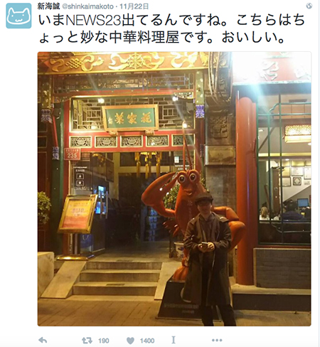 马不停蹄地参加完电影首映活动后,新海诚还顾不上休息与工作人员一同坐在影院座椅上吃起了盒饭。一路上,新海诚都会把每时每刻在中国的见闻传到Twitter上与影迷分享。第二天是与中国传媒大学动画专业的学生对话,最后是与粉丝的签票活动。在飞回东京前,新海诚还专程去了北京的官府菜馆,留下一句“很好吃”的评价。