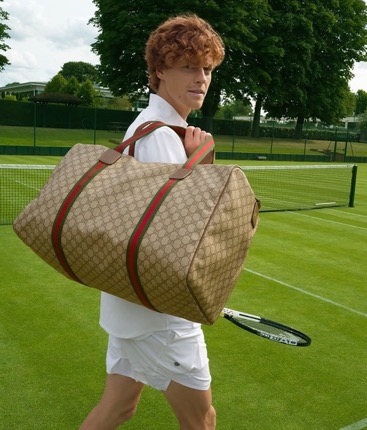 2022年,辛纳被Gucci任命为品牌大使。今年的温网,Gucci提前向严格的温网官方申请,打破球员全白的着装要求,让辛纳在首轮比赛时将Gucci的网球包带进了中央球场。